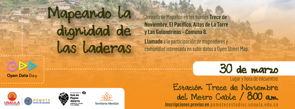 En el marco de la articulación solidaria entre el Hot de Mapeo Abierto de América Latina y el Caribe y el Centro de Estudios con Poblaciones, Movilizaciones y Territorios – POMOTE de la Universidad Autónoma Latinoamericana, hacemos la convocatoria pública para la realización del Open Data Day con la realización de un recorrido de mapeo de viviendas, espacios comunitarios y factores de riesgo de los barrios 13 de Noviembre, el Pacífico, Altos de la Torre y las Golondrinas en la Comuna 8 de Medellín.