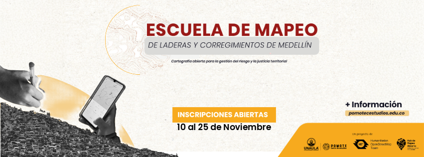 La Universidad Autónoma Latinoamericana – UNAULA, a través del Centro de Estudios con Poblaciones, Movilizaciones y Territorios – POMOTE, en alianza con el Equipo Humanitario de OpenStreetMap (HOT LAC), invita a las organizaciones sociales y comunitarias de los cinco corregimientos, la ladera occidental y la ladera oriental de Medellín a postular sus procesos para participar en la Escuela de Mapeo de Laderas y corregimientos del distrito, un proceso formativo que entrelaza conocimiento abierto, participación comunitaria y tecnologías libres para fortalecer la gestión del riesgo, la resiliencia climática y la justicia territorial en los territorios priorizados.