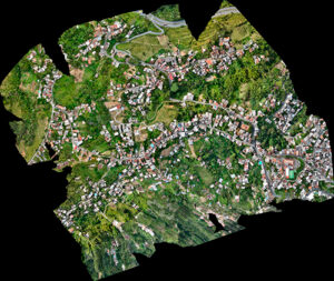 Vista aérea del poblamiento urbano y zonas de reserva de bosque de la Vereda Barro Blanco en el Corregimiento de Santa Elena.